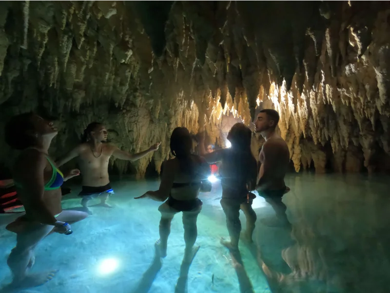 With pick up at your hotel air b&b or closest meeting point we will take you to explore with a certified guide the Mystic Mayan ruins of Tulum located in front of the Mexican caribean, enjoy free time to take pictures and feel the vibes of this site, then lets swin and explore the infraworld how the Mayans call the cenotes and the underground rivers where we will guide you through crystal clear waters to admire the stalactites and stalacmites with interesting stories of how they were formed ages ago and the meaning for the Mayan culture. To finish enjoy nice Mexican tacos and back to your hotel.